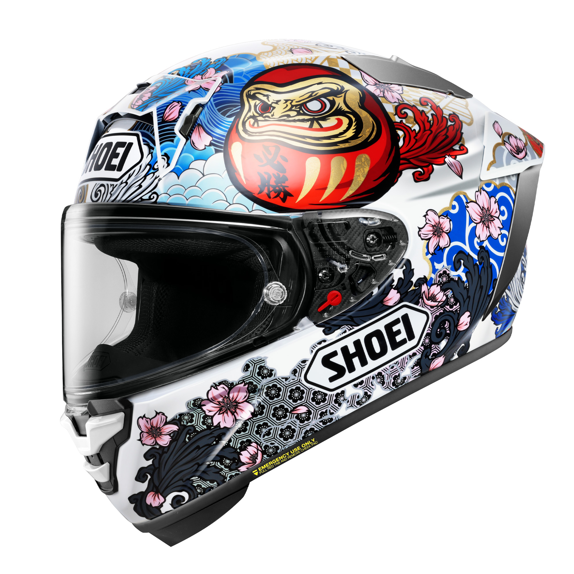 Emergency Quick Release System for easy helmet removal in case of an accident. Pull to remove cheek pad.