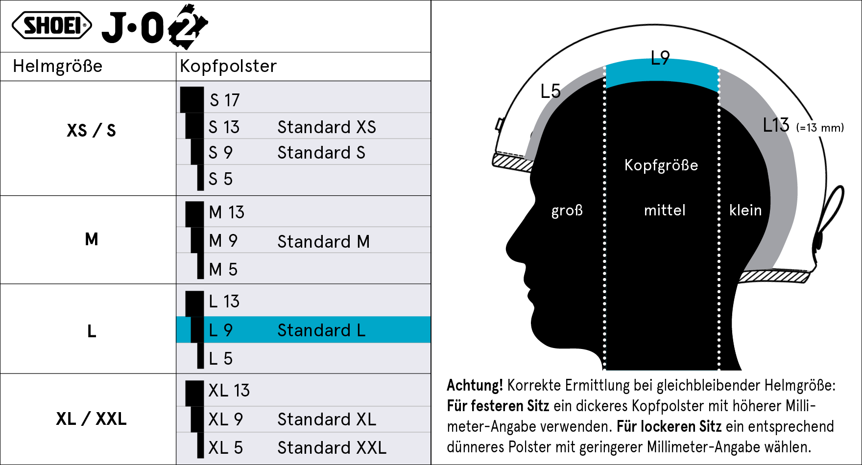 Kopfpolster in unterschiedlichen Größen können zur individuellen Anpassung des Helmes im Oberkopfbereich eingesetzt werden. Die Polster eines Helmmodells sind im Rahmen ihrer Größenzuweisung, z.B. "L5" - "L9" - "L13", austauschbar. "L5" steht dabei für ein dünneres, "L13" für ein dickeres Polster, wie im nachfolgenden Schaubild ersichtlich.