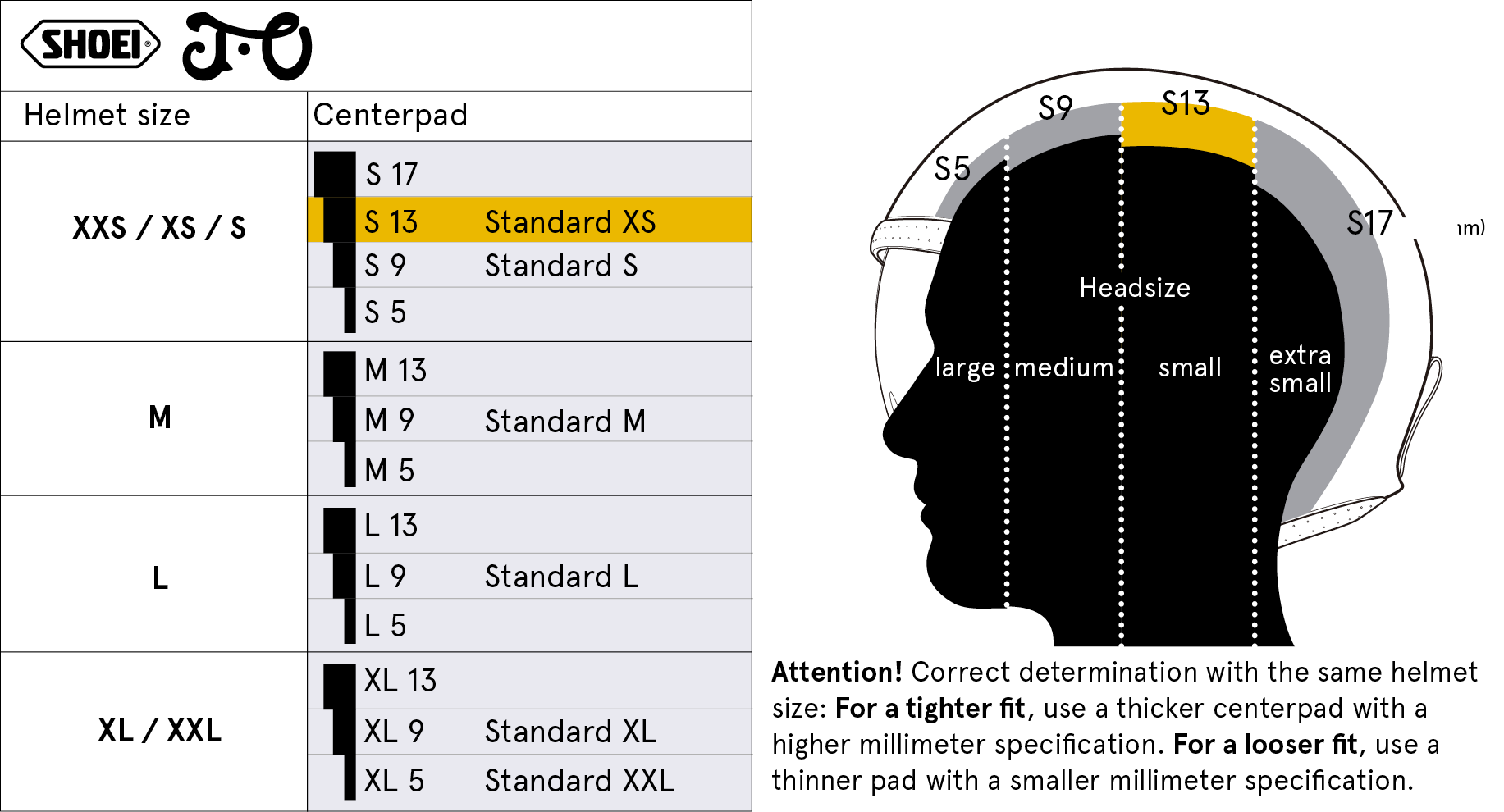 Head pads in different sizes can be used for individual adjustment of the helmet in the upper head area. The pads of a helmet model are interchangeable within the scope of their size allocation, e.g. "S5" - "S9" - "S13". "S5" stands for a thinner, "S13" for a thicker padding, as shown in the following diagram.