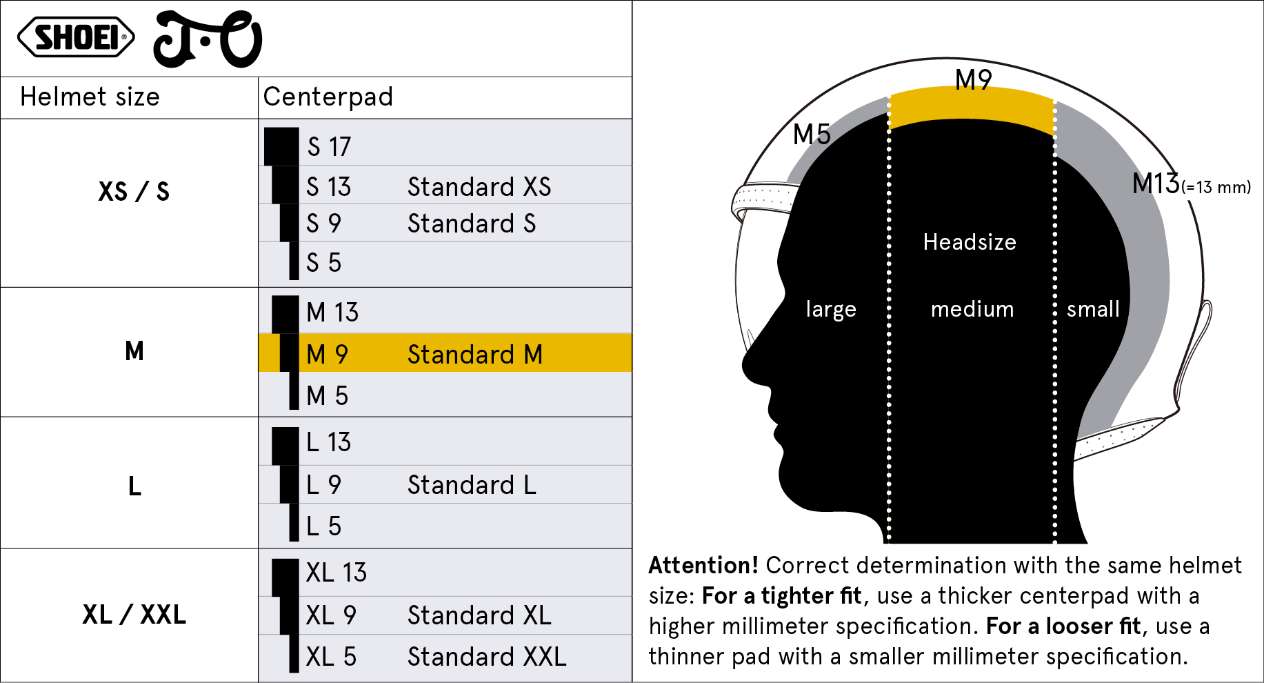 Head pads in different sizes can be used for individual adjustment of the helmet in the upper head area. The pads of a helmet model are interchangeable within the scope of their size allocation, e.g. "M5" - "M9" - "M13". "M5" stands for a thinner, "M13" for a thicker padding, as shown in the following diagram.
